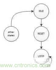 CPLD其內部沒有RAM,這樣就不能依靠RAM的初始化數據來產生可靠的復位;從原理上說,器件上電后,其寄存器的狀態是不確定的,因此我們是沒法得到一個確定的初始狀態去產生一個可靠的內部復位信號,不過我們還是可以產生一個有一定失敗概率但概率可控的復位信號,其基本原理是:設計一個n位的狀態機,見下圖,其中一種狀態表示復位結束(記為LOOP),只要進入該狀態就會一直保持在LOOP狀態上,至于其他狀態都會跳入復位狀態(記為RESET),RESET狀態是暫態,一個時鐘周期就離開進入LOOP狀態;由于狀態LOOP出現的概率僅為:1/2n,我們控制n的長度,就可以將復位失敗概率控制在設定的要求內。
