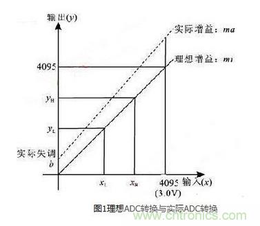 在計算機(jī)測控系統(tǒng)中,對象數(shù)據(jù)的采集一般包含兩種基本物理量:模擬量和數(shù)字量。對于數(shù)字量計算機(jī)可以直接讀取,而對于模擬量只有通過轉(zhuǎn)換成數(shù)字量才能被計算機(jī)所接受,因此要實現(xiàn)對模擬量準(zhǔn)確的采集及處理,模數(shù)轉(zhuǎn)換的精度和準(zhǔn)確率必須滿足一定的要求。由于F2812的ADC具有一定增益誤差的偏移誤差,所以很容易造成系統(tǒng)的誤操作。下面分析兩種誤差對線性電壓輸入及A/D轉(zhuǎn)換結(jié)果的影響。