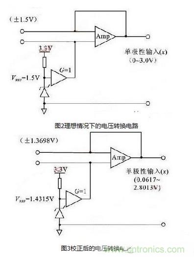 在實際應(yīng)用中,所采集的信號經(jīng)常為雙極型信號,因此信號在送至ADC之前需要添加轉(zhuǎn)換電路,將雙極型信號轉(zhuǎn)化為單極型信號。典型的轉(zhuǎn)換電路如圖2所示。對于ADC模塊,考慮到增益誤差和失調(diào)誤差對輸入范圍的影響,轉(zhuǎn)換電路需要調(diào)整為如圖3所示的電路。在圖3中,輸入增益誤差的參考范圍已經(jīng)改變。
