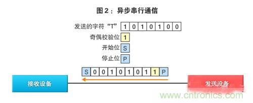 在異步通信模式的串行通信狀態下,一字節的文字信息※1在“開始位”(Start bit,意味著開始發送)和“停止位”(Stop bit,意味著停止發送)之間發送(圖2)。由此,無需I2C (Inter-Integrated Circuit,內部集成電路)”及“SPI(Serial Peripheral Interface,串行外設接口)”等時鐘信號線(但在其他的串行通信模式中這些時鐘信號線是必需的,以對發送和接收的時序進行同步)。另外,還可追加用于檢查數據是否已正常發送的“奇偶校驗位(Parity bit)※2”。