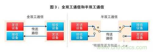 在異步通信中,能實現按“單片機→外圍設備”或“外圍設備→單片機”的方向確保數據信號專用的信號線時,被稱為全雙工通信。另一方面,將通過1根信號線來切換通信方向的方式稱為半雙工通信。全雙工方式時需要2根信號線,可同時進行發送和接收。半雙工方式時僅需1根信號線,但必須在發送和接收之間進行切換(圖3)。