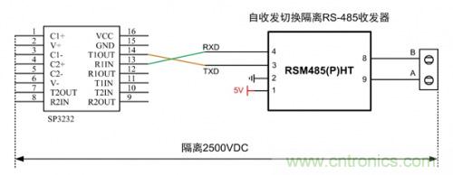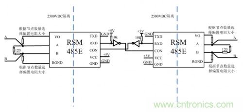 方案一用的是內部支持自收發的RSM485PHT系列,UART端交叉連接即可。方案二用的是常規帶收發控制引腳的隔離485,需多用非門電路對收發進行控制。