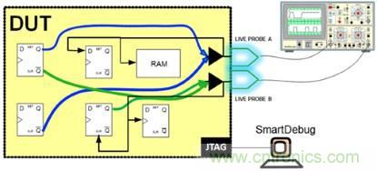 -現場探頭:允許采用兩個專用探頭,經配置用于觀察邏輯元件中任何輸入或輸出的探測點(圖1)。然后,探頭數據可發送到示波器或甚至重新引導回到FPGA結構,驅動內部邏輯分析儀。這些探測點是實時動態的。探測點可以通過軟件在運行中更改,不需要把FPGA重新編譯或重新編程。