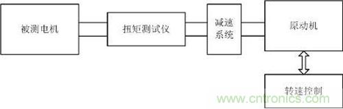 在國標GBT/ 30549-2014里對齒槽轉矩的測試有了明確的定義:電機繞組開路時,電機回轉一周內,由電樞鐵心開槽,有趨于最小磁阻位置的傾向而產生的周期性力矩。齒槽轉矩的測試方法常用的有:杠桿測量法、轉矩儀法。杠桿測量法比較簡單,測量精度比較差,所以主要用于對精度要求不高的場合。轉矩儀法架構圖如圖2所示,由于伺服電機的齒槽轉矩非常小,所以測試時需要以一個非常低的轉速來帶動未上電的被測電機來完成測試,原動機輸出后要先經過減速系統,將轉速降至1rpm/min左右,然后帶動被測電機進行測試,用扭矩傳感器測試出齒槽轉矩。在測試過程中需要處理好原動機和傳動系統本身轉矩波動使得輸出的轉速扭矩更加平滑,以減小傳動系統的扭矩波動對測試結果的影響。