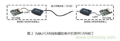 雖然如今已經不再是51單片機橫行的時代,但是仍然不是所有的MCU都具備CAN控制器,如果在某個項目中需要擴展CAN通訊而恰好我們的主控平臺沒有CAN外設,那么選擇CSM100就是一個絕佳的選擇。只要主控上還有多余的URAT資源就可以利用它輕松的擴展。擴展方式如圖2所示。