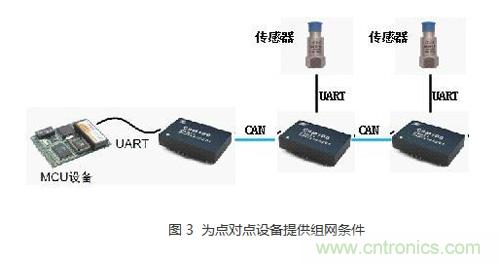 我們都知道CAN總線是一種多主總線,可以實現多節點組網通訊,自帶優先級仲裁機制,可有效防止數據沖突。基于這一優點,可以利用CSM100模塊為點對點通訊設備提供組網的條件。例如,某些串口接口的傳感器,如果我們需要把多個傳感器的數據讀到MCU而MCU的串口數量不足怎么辦呢?