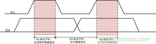 I2C總線進(jìn)行數(shù)據(jù)傳送時(shí),時(shí)鐘信號(hào)SCL為高電平期間,數(shù)據(jù)線SDA上的數(shù)據(jù)必須保持穩(wěn)定,只有在時(shí)鐘線SCL上的信號(hào)為低電平期間,數(shù)據(jù)線SDA上的高電平或低電平狀態(tài)才允許變化,如圖3所示。