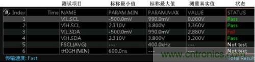 使用I2C時(shí)序分析軟件,它能夠在極短的時(shí)間內(nèi)完成總線信號(hào)的DC特性和AC特性分析,并與器件手冊(cè)標(biāo)稱參數(shù)做對(duì)比,直接輸出測(cè)試結(jié)果(Pass/Fail),同時(shí)支持報(bào)表導(dǎo)出,省去人工錄入數(shù)據(jù)的煩惱,極大的提升測(cè)試效率。具體測(cè)試界面如下圖4所示。
