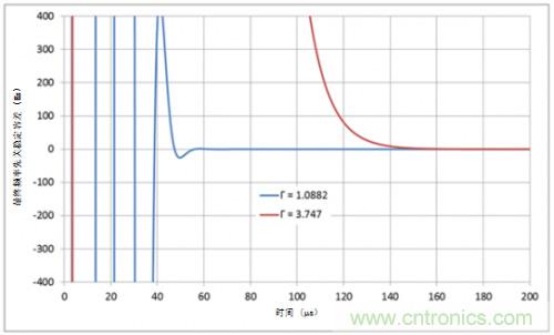 但較高的伽馬值也有其蔽處:鎖定時間更長。圖4所示為不同伽馬值下200MHz頻率躍變的鎖定時間;回路帶寬和相位邊限保持不變。當伽馬值和回路帶寬分別為1和3.7,穩定容差在±100Hz范圍內,模擬鎖定時間值分別為46.5µs與118µs。
