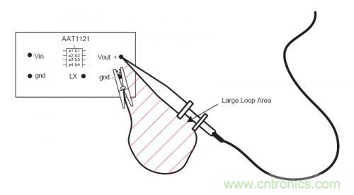 在測量中,如何減小拾取的輻射噪聲?最簡單可靠的方法是采用一個接地環來測量電源紋波以及噪聲。為了進一步的降低測試誤差,可以將示波器探頭和地線直接放在電源輸出電容得兩端。如下圖所示,采用這種方法,在信號探頭和地線之間的環路面積很小,所以測量中帶來誤差的噪聲幾乎可以忽略。