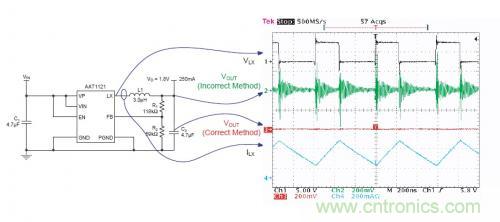 下圖描述了采用兩個不同的測試方法得到的Vout波形。電源電路是一個BUCK轉換電路(AAT1121),工作在1.5MHz的開關頻率,輸出電壓為1.8V/250mA。示波器采用全帶寬測試。可以看到伴隨著PWM開關,在綠色的trace2有一個很高的噪音以及振鈴,但是trace3上卻沒有明顯的噪聲。通過對比可以看到,測試方法的選擇對結果的準確性很關鍵。