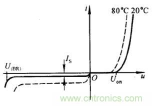 在環境溫度升高時,二極管的正向特性曲線將左移,反向特性曲線將下移,如圖1所示。在室溫附近,溫度每升高1℃,正向壓降減小2~2.5mV;溫度每升高10℃,反向電流約增大一倍??梢?,二極管的特性對溫度很敏感。