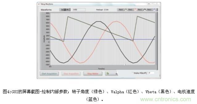 基于SmartFusion2 SoC FPGA的多軸電機控制解決方案通過USB連接至主機PC,并與圖形用戶界面(GUI)通信,進行啟動/停止電機,設置電機速度值和其他系統參數,描繪多達四個系統變量,例如電機速度、電機電流和轉子角度(圖4)。