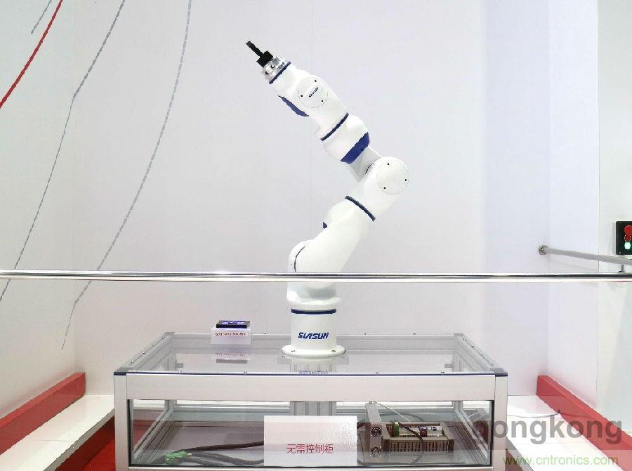 現場,內置Gold Twitter的新松七軸協作機器人華麗亮相,動作輕柔簡潔,控制柜體量小,線纜清晰明了。楊崇武先生介紹,在當前的智能制造時代,設備越來越輕量化,埃莫的Gold Twitter系列可以放置在移動荷載上、電機上或電機內,從而提高性能、節省空間,減少電纜和幾乎不需要電氣柜。