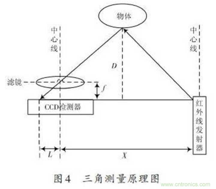 紅外感應(yīng)器包含紅外發(fā)射器與CCD檢測器,紅外線發(fā)射器會發(fā)射紅外線,紅外線在物體上會發(fā)生反射,反射的光線被CCD檢測器接收之后,由于物體的距離D不同,反射角度也會不同,不同的反射角度會產(chǎn)生不同的偏移值L,知道了這些數(shù)據(jù)再經(jīng)過計算,就能得出物體的距離了,如下圖所示。