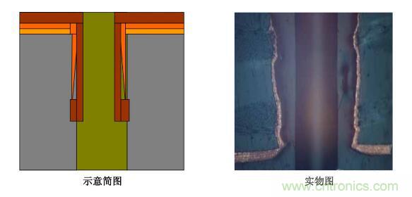 5.圖電孔無銅:斷口處圖電層未將板電層包住―――圖電層與板電層厚度均勻,斷口處齊斷;圖電層呈拉尖趨勢直至消失,板電層超過圖電層繼續延伸一段距離再行斷開。