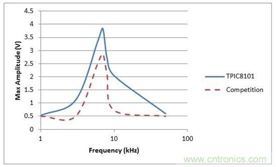 圖 2 顯示了表 1 中的結果。 噪聲等級 () 在兩個器件之間大概是相同的,因為遠離中心頻率的振幅基本相同。 在中心頻率,TPIC8101 具有更高的振幅,這意味著其 SNR 要優于競爭產品。