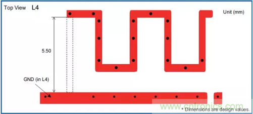 曲流型天線的長度比較難確定。長度一般比四分之一波長稍長,其長度由其幾何拓撲空間及敷地區決定。曲流型天線一般是PCB封裝,即板載天線。和倒F型一樣,天線一般放置在PCB頂層,鋪地一般放在頂層并位于天線附近,但天線周圍務必不能放置地,周圍應是凈空區。如圖2,圖3: