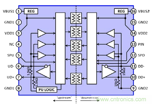 2. 它必須管理USB電纜上的雙向通信,確保其收發(fā)器在適當(dāng)?shù)臅r候進(jìn)行發(fā)送和接收,并精確重現(xiàn)所有驅(qū)動和空閑狀態(tài)。若要精確重現(xiàn)空閑狀態(tài),它必須在其上游側(cè)配置上拉電阻,以模擬連接下游外設(shè)的上拉電阻狀態(tài)。它在下游側(cè)也需配置下拉電阻。必須監(jiān)控總線上表示總線空閑、分組開始和分組結(jié)束的信號,以便正確響應(yīng)這些狀況。