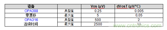表1顯示了連續(xù)時間和零漂移放大器的Vos和dVos/dT的比較。請注意,零漂移放大器的Vos和dVos/dT要小三個數量級。