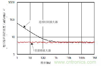 圖5顯示了零漂移(紅色)和連續(xù)時間(黑色)放大器的1/f和寬帶電壓噪聲頻譜密度。注意零漂移曲線沒有1/f電壓噪聲。