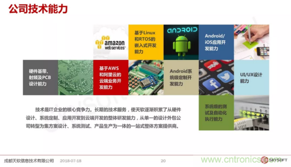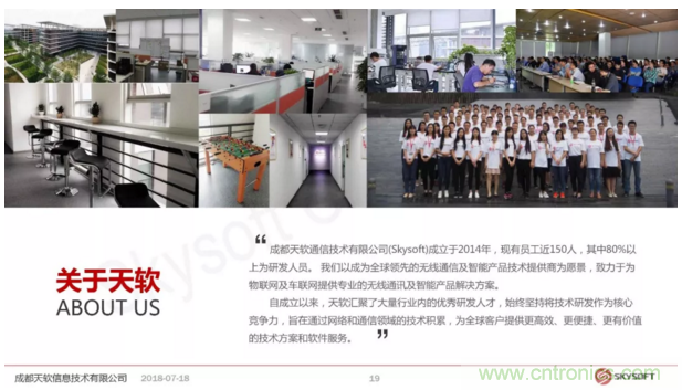 天軟信息成立于2014年,現(xiàn)有員工近150人,其中80%為研發(fā)人員。公司以成為全球領(lǐng)先的無線通信及智能產(chǎn)品技術(shù)提供商為愿景,致力于為物聯(lián)網(wǎng)及車聯(lián)網(wǎng)提供專業(yè)的無線通訊及智能產(chǎn)品解決方案。Skysoft是西部為數(shù)不多的擁有獨(dú)立綜合通信測(cè)試實(shí)驗(yàn)室,并能提供LTE終端產(chǎn)品/模塊、無線路由器、車載通信及多媒體等軟硬件研發(fā)能力的高新技術(shù)企業(yè)。