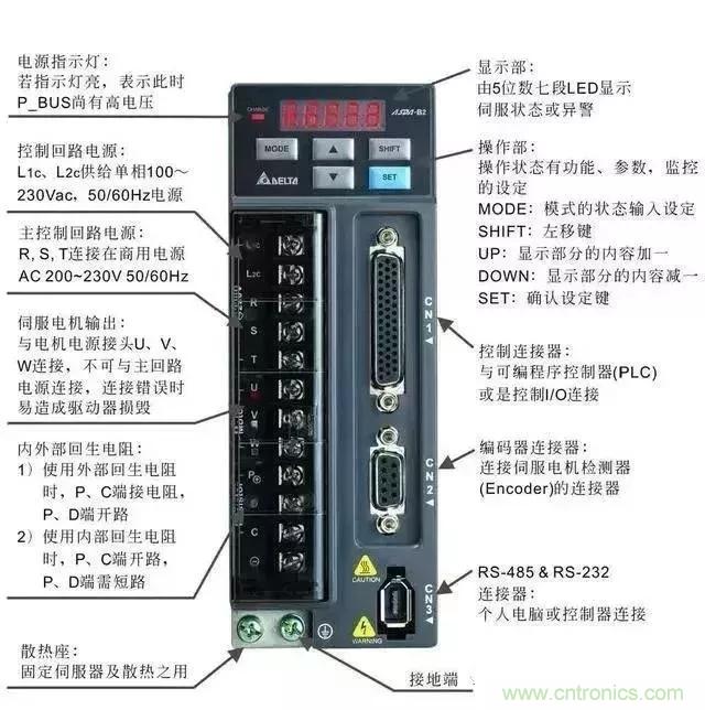 伺服驅動器主要有控制回路電源、主控制回路電源、伺服輸出電源、控制器輸入CN1、編碼器接口CN2、連接起CN3??刂苹芈冯娫词菃蜗郃C電源,輸入電源可單相、三相,但是必須是220v,就是說三相輸入時,咱們的三相電源必須經(jīng)過變壓器變壓才能接,對于功率較小的驅動器,可單相直接驅動,單相接法必須接R、S端子。伺服電機輸出U、V、W切記千萬不能與主電路電源連接,有可能燒毀驅動器。CN1端口主要用于上位機控制器的連接,提供輸入、輸出、編碼器ABZ三相輸出、各種監(jiān)控信號的模擬量輸出。