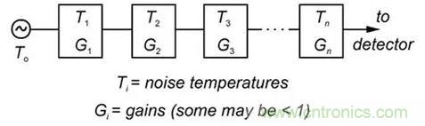 圖1:以天線或其他來源的等效噪聲溫度為起點,累加各階段的噪聲溫度可確定系統中各點的噪聲。(圖片來源:新澤西理工學院)