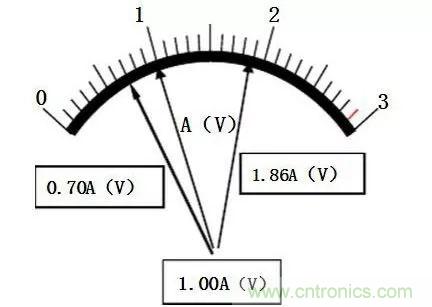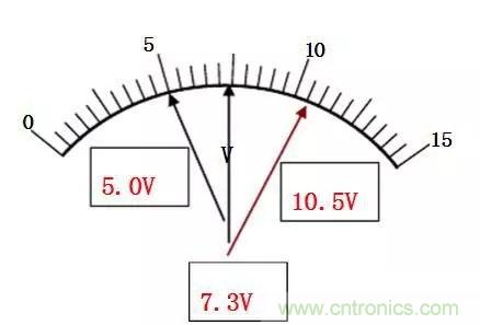 表盤的最小分度值為0.5V/格,雖能準確讀到0.5V,但誤差仍出現(xiàn)在最小分度值的同一數(shù)位上,即以V為單位的十分位。其估讀法則是:將最小分度分為五等分,即為0.1V。
