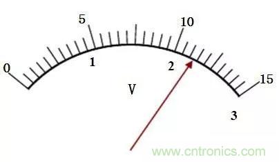 若是0~15V檔,最小分度值為0.5V, 半格為0.25V,通常可估讀為0.2V或0.3V。(因有效數(shù)字出現(xiàn)在以V為單位的十分位上)。圖中讀數(shù)應為 11. 2V或11.3V。