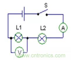 此時L2相當于一根導線,只有L1和電流表接入電路,電壓表測的是電源電壓。當然此時的電壓表是有示數(shù)的。