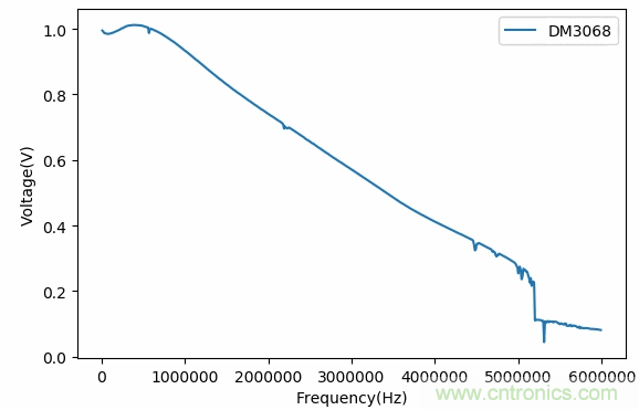 不同萬用表測量交流頻率的上限各不相同。下面使用DS345產生10kHz到6MHz,有效值為1V的正弦信號,使用DM3068數字萬用表交流電壓檔測量信號的幅值。