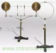 赫茲將兩個大的銅球作為電容,并通過銅棒連接在相隔很近的兩個小銅球上。兩個小銅球連出兩根導線,接到一個感應線圈和一個電源之上。