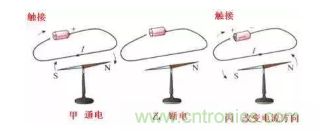 上圖展示了電流的磁效應,導線通電之后,周圍產生的磁場使磁針發生了偏轉。