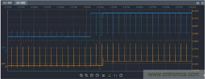 其加入6.5V共模電壓及差分電平為0.5V后的波形細節如圖7所示,當總線處于空閑狀態時,CANH和CANL的電壓由正常被拉高到共模電壓附近,當總線處于驅動狀態時,CANH和CANL的電壓近似顯、隱性狀態時的正常電壓,在驅動狀態過程中,電平轉換時由于一直受到共模電壓的影響,隱性電平或顯性電平會有些坡度。