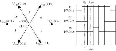 如圖2所示,電機的驅動采用了七段式的空間矢量法(SVPWM,SpaceVectorPWM),利用六個依次相差60度的基本矢量和全0矢量(與全1矢量等效),根據不同的作用時間合成按給定轉速作圓周轉動的旋轉矢量。