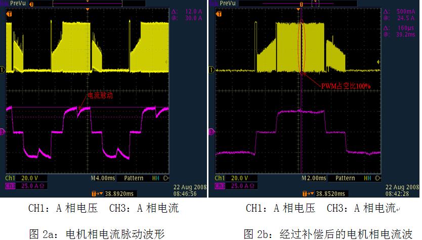 圖2b是采用XC866控制芯片的系統在經過上述方法優化后測得的換相電流波形,由圖2b可以看出,換相時的電流脈動基本消除,電機的相電流基本接近方波。用了這套控制系統的電動車,起步加速以及運行時的電機震動已基本消除,實現了超靜音控制器的設計。
