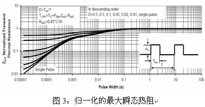 由圖3最下面一條曲線(單脈沖)可知,對于單脈沖來說,要想獲得0.015的熱阻系數,其脈沖寬度不能大于20us。