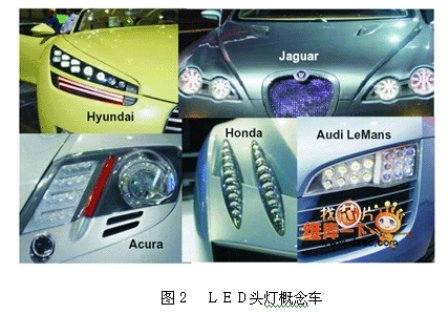 從LED的應用歷史來看,早在1992年時已經有LED應用于第三剎車燈上的先例;而在2000年時則進一步的應用于尾燈、轉向燈與剎車燈;到了2002年Audi A8率先將LED光源置于前置燈具內作為日行燈,開啟了設計師與工程師們在前置燈具的想象空間。在之后的許多國際車展上都可以看到LED作為前照燈源的概念車,如圖2所示。