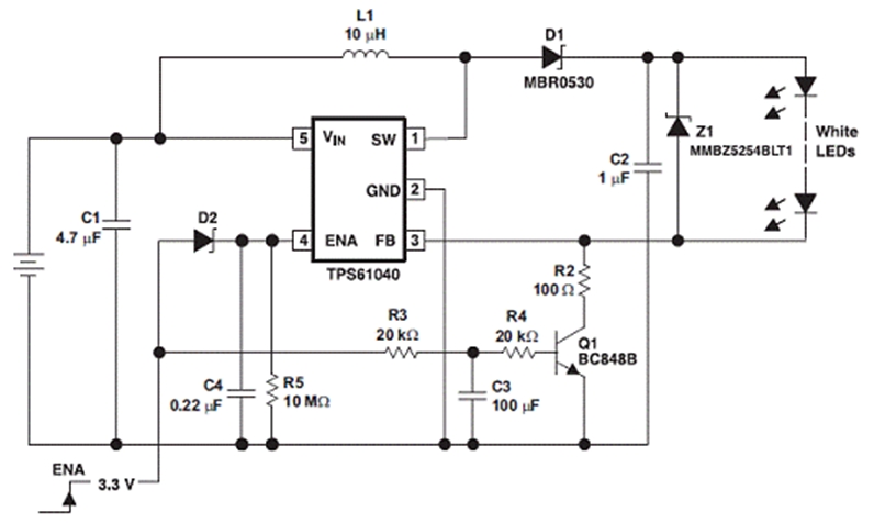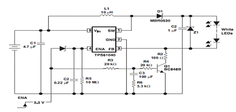 許多采用白光 LED">LED 照明和背光的消費類產品都支持開關時的漸進性 LED">LED 發光變化。這種漸進性的發光變化通常要借助可提供 PWM 發光變化控制功能的微處理器來完成。在此,我們將介紹一款采用德州儀器 (TI) TPS61040 白光 LED">LED 驅動器的電路,其在不使用微處理器的情況下同樣也可以實現開關時的漸進性發光變化。