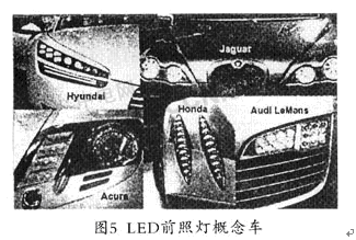 在全部車LED燈具中,最難也是最后投入使用的則是車頭前照燈。目前LED前照燈都是用在一些車展上的概念車上,如圖5所示。