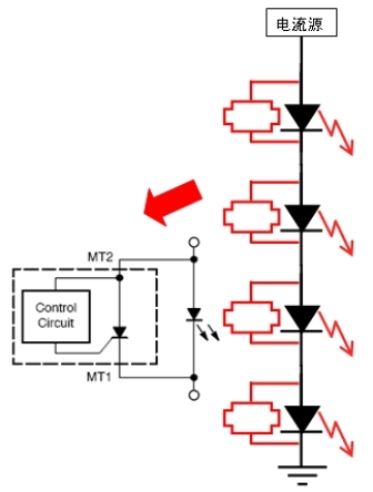 如前所述,LED是一種使用壽命極長的光源(可長達5萬小時)。除了需要針對具體的LED應用選擇適合的LED驅動解決方案,還需要為LED提供適當的保護,因為偶爾LED也會失效。其原因多種多樣,可能是因為LED早期失效,也可能是因為局部的組裝缺陷或是因瞬態現象導致失效。必須對這些可能的失效提供預防措施,特別是因為某些應用屬于關鍵應用(故障停機成本高),或是安全攸關的應用(如頭燈、燈塔、橋梁、飛行器、飛機跑道等),或是在地理上難于接近的應用(維護困難)等。在這方面,可以采用安森美半導體的NUD4700 LED分流保護解決方案。圖5是這種分流保護解決方案的應用及原理示意圖。