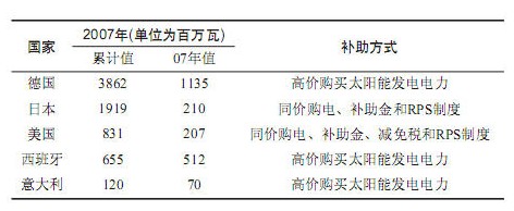 在太陽能發(fā)電上領先的歐洲,主要采用電力公司以高于普通電力的價格購買太陽能發(fā)電系統(tǒng)所發(fā)的電力。而美國和日本則采用與普通電力相同的價格購買太陽能發(fā)電系統(tǒng)所發(fā)的電力。美、日還補助用戶購置太陽能發(fā)電系統(tǒng)。下表列出了幾個先進國家的太陽能發(fā)電的發(fā)電量(單位為百萬瓦)和補助措施。