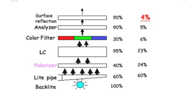 [page]首先,這種方法省去了彩色濾色片,而濾色片是光能的主要吸收者,它會損失光能70%以上。圖2表明了光能從光源出發以后所受到的損失。