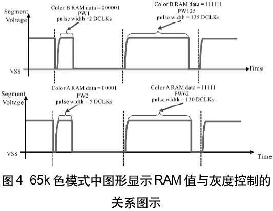 下面的舉例示范在65K色模式下,對應灰度級的GDDRAM數據(DCLK:顯示時鐘)。
