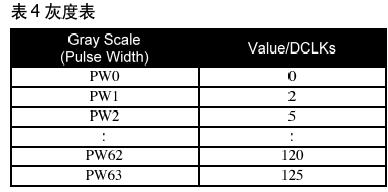 全彩顯示對每一個RGB原色分量提供6-bit,即64級灰度,通過電流驅動階段列驅動的脈寬調制(PWM)設置不同的灰度級。灰度表即為存儲了對應64級灰度(GS0~GS63)的PWM(PW0~PW63)的值。脈寬越寬,象素顯示越亮。因此,每個象素的顯示亮度由灰度表中的脈寬值決定。