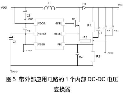 這是一個開關電壓產生電路,專為手持設備設計。在SSD1338中,內置的DC-DC電壓轉換器,配合外部應用電路(如圖5),可以經由低壓供電VDD產生高壓驅動Vcc,能供給OLED驅動電路。以下的示例是一個3V的VDD輸入產生一個12V,20到30毫安Vcc輸出的應用。