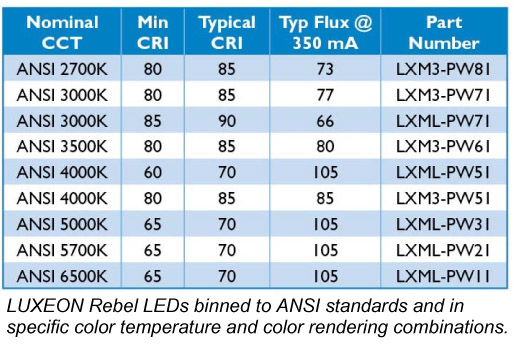 這九款新的LUXEON Rebel LED產品根據美國國家標準化組織(ANSI)的標準進行電阻分檔,均達到了最低規定演色系數。每一款產品的光輸出和光通維持率均達到了ENERGY STAR®和其他光效標準。另外,新產品也具備其他LUXEON Rebel系列產品所公認的高效,長使用壽命及高可靠性的特點。