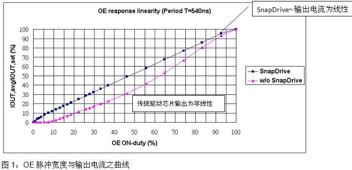 以下為臺灣迅杰科技推出包含SnapDriveTM技術之驅動芯片測試條件及結果,藉圖1及圖3可以明顯看出其驅動芯片在極小的OE脈沖寬度下其輸出電流仍為線性輸出,而傳統驅動芯片則無法提供線性的輸出。