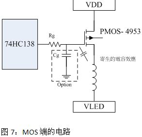 掃描屏上;建議在MOS的Gate端與74HC138之間串一個電阻,以避免VLED端的電感效應及MOS端寄生電容所產生的突波,造成74HC138燒毀;建議Rg<100Ω、Cg<47pF(電容部份可選擇不加)。